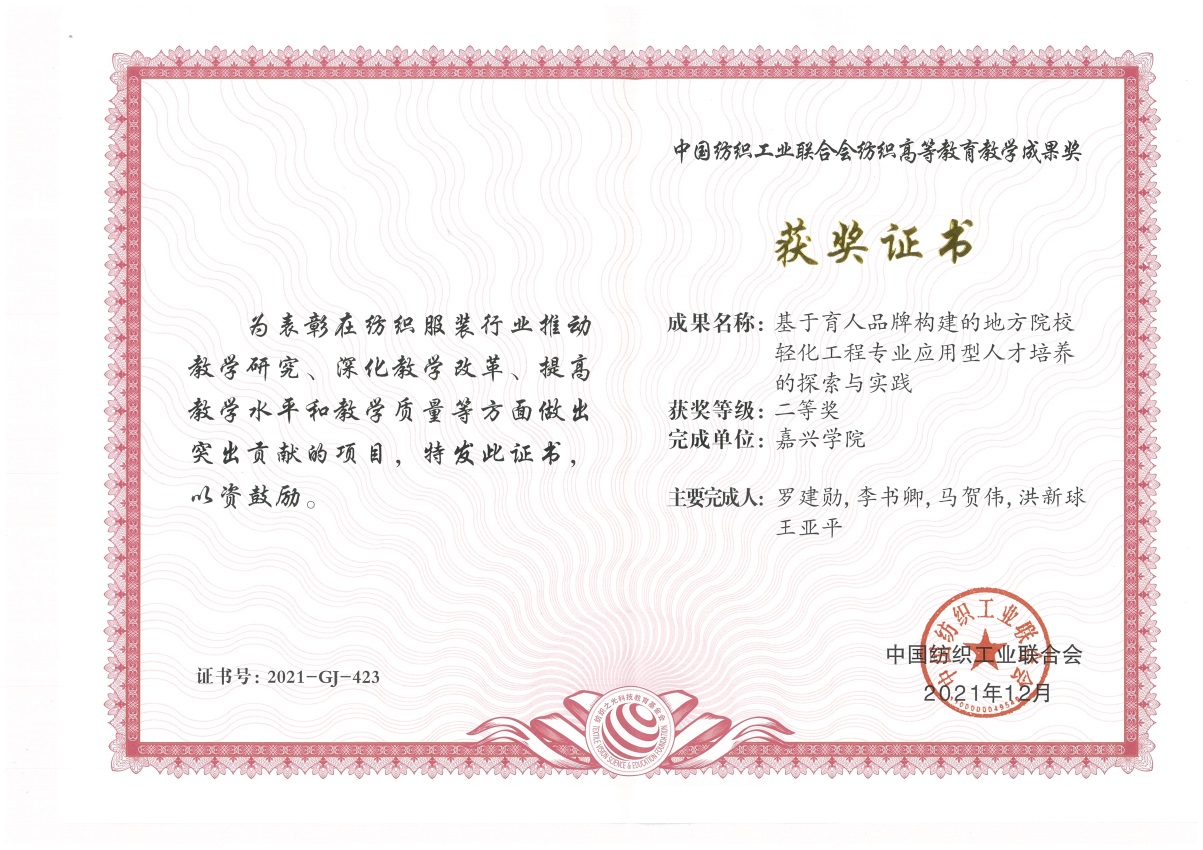 近日,“纺织之光”2021年度中国纺织工业联合会纺织高等教育教学成果奖评审结果揭晓并颁奖,由我院教师罗建勋、李书卿、马贺伟、洪新球、王亚平等组成的教科研团队申报的题为“基于育人品牌构建的地方院校轻化工程专业应用型人才培养的探索与实践”获“纺织之光”中国纺织工业联合会纺织高等教育教学成果二等奖。