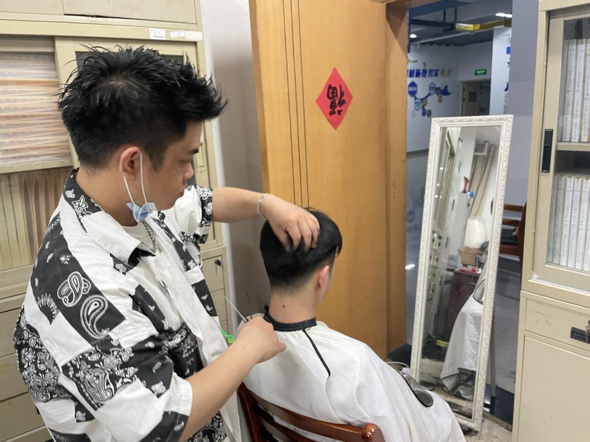 “帮我简单的修一下,只要不遮住眼睛就好”“好嘞,肯定给你理得帅气又英俊”。二楼的理发点,“tony”老师和学生简短的对话有效的表明了需求,排队、落座、指尖与剪刀间相互交缠,碎发随着刀尖悉悉落下,10分钟左右,坐在椅子上学生的发型变得精神整洁,理发师驾轻就熟的为男同学剪出了理想的发型。