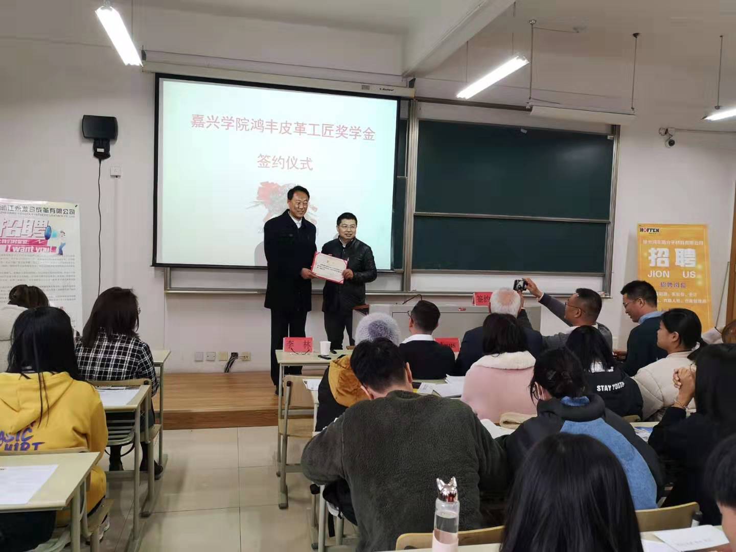受院长委托,罗建勋代表学院及轻化工程系对客人们莅临我院表示热烈欢迎,感谢鸿丰公司对我院轻化工程专业教育事业的支持,同时,简要介绍了近年来轻化工程专业在专业建设、人才培养、教学科研及实验室建设等方面的发展情况。陈治军总经理和王新才总经理就行业的情况、人才的需求和成长给师生们做了分享。陈治军总经理和罗建勋主任分别代表鸿丰公司、轻化工程系签约“鸿丰皮革工匠奖学金”。随后,李林高工给师生了做了题为“励志皮革行业,成就无悔青春”的报告。在活动中,分别聘任陈治军总经理、李林高工为我院轻化工程系创新创业导师和校外兼职教师。另外,客人们还参观了轻化工程实验室。 最后,两家公司进行了招聘宣讲和面试。