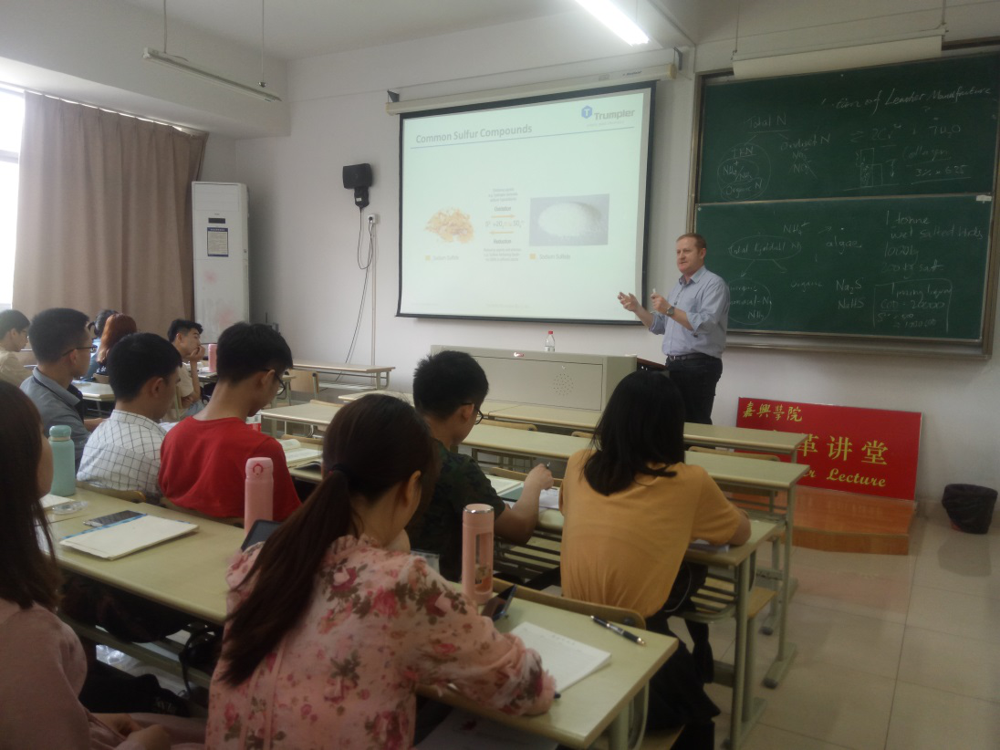 为了进一步加强我院轻化工程专业的内涵建设和国际化交流,应我院轻化工程系的邀请,德国TRUMPLER公司技术专家、轻化工程专业客座教授Dr Jeffry和公司技术经理、每日大赛 校友陈正栓先生于5月18日莅临我院并做客“皮革讲堂”,为TRUMPLER皮革实验班学生讲授《Cleaner production of leather manufacture》课程,内容包括“Leather Overview”、“Leather Manufacture & Pollution Overview”、“Pollutants in Leather Manufacture”、“Cleaner Technologies”等。