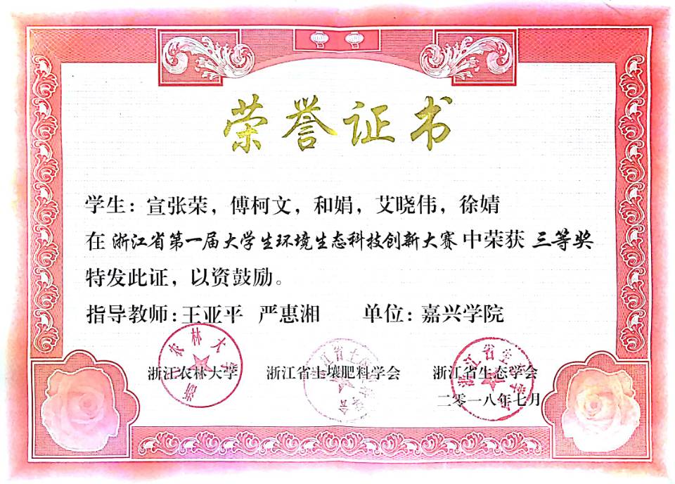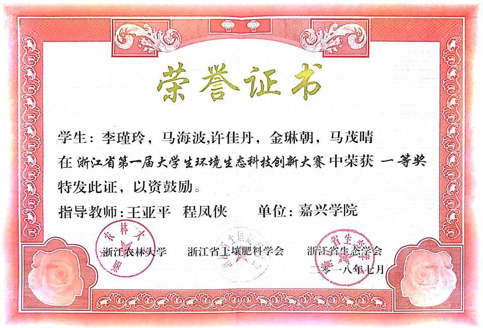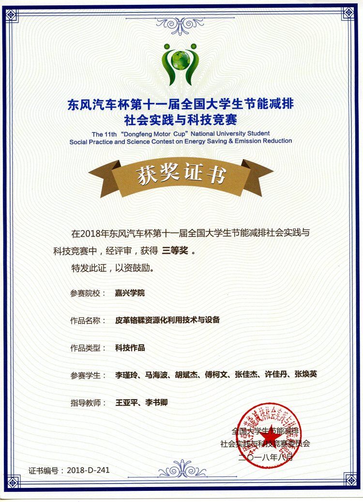 由我院王亚平、程凤侠、李书卿、黄芳芳等老师指导的轻化工程专业学生项目“铬鞣废液资源化利用及设备”和“皮革终水回用技术与设备”,先后获得:2018年东风汽车杯第11届全国大学生节能减排社会实践与科技竞赛三等奖(国家级AⅢ类); 2018年建行杯第四届浙江省“互联网+”大学生创新创业大赛铜奖(省级AII类,已公示);2018年浙江省第一届大学生环境生态科技创新大赛一等奖、三等奖(省级B类)。