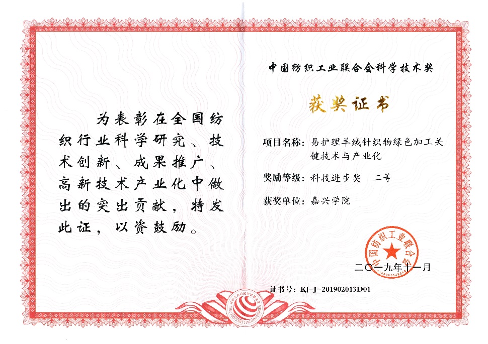 2019年12月6日,“纺织之光”2019年度中国纺织工业联合会科技教育奖励大会在北京人民大会堂召开,表彰本年度科学技术、教育等获奖代表。我院纺织系沈加加副教授团队承担的项目——“易护理羊绒针织物绿色加工关键技术与产业化”荣获中国纺织工业联合会科技进步二等奖。