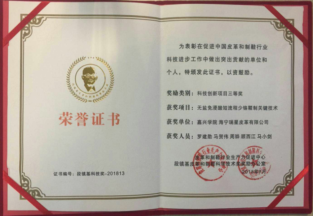 2018年9月27日,中国皮革和制鞋行业生产力促进中心等单位在河北辛集举办了“中国皮革业发展论坛暨全国轻机标委会皮革机械分委会工作会议”。会上对本年度“段镇基皮革和制鞋科学技术奖”进行了颁奖。其中我院轻化工程系罗建勋老师主持完成并产业化的科研项目“无盐免浸酸短流程少铬鞣制关键技术”荣获“科技创新项目三等奖”。