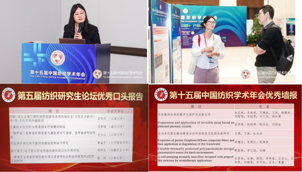 研究生在本次年会中表现突出。2024届硕士研究生刘梦瑶以《无氟疏水改性防水透湿纳米纤维膜的制备》作口头报告,并获得了研究生论坛优秀口头报告。2023届硕士研究生沈楹洁的“多孔石墨烯/MXene复合纤维的性能及其在染料废水降解中的应用”墙报获评年会优秀墙报。