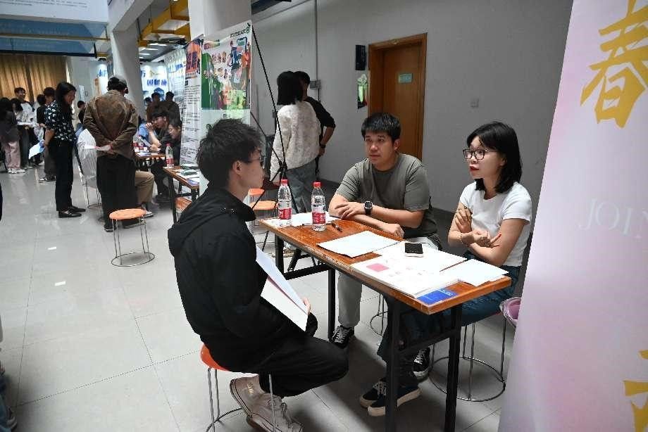 招聘会现场,招聘单位通过面对面交流、播放宣传片、展板等多种方式向参会同学介绍公司的概况、每日大赛、职业规划、人员需求以及福利待遇,其中新凤鸣集团股份有限公司在现场开展宣讲会。