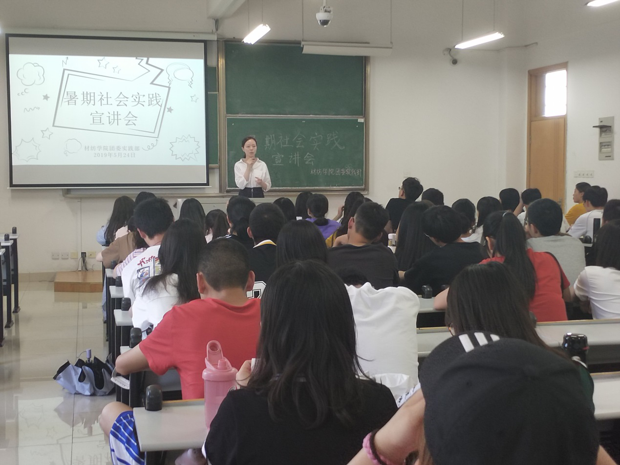 为引导材纺学子在实践中了解社会热点,增强社会责任感,高品质完成2019年暑期社会实践,学院团委精心策划此次宣讲会。会议伊始,刘洋老师上台做主要讲话,对暑期社会实践的意义、要求、参与方式进行详细介绍,同时鼓励大家积极参加2019暑期社会实践活动。随后,由郑晓钰同学和桑婧婧同学分别代表往期优秀实践团队做成果展示和经验传授。最后,刘洋老师结合往期实践团队的情况,为同学们的方案设计提供了思路指引,强调了注意事项,解答了心中疑惑。