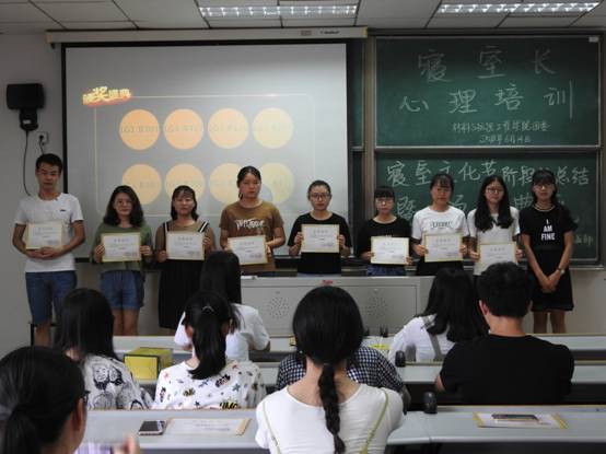 614日中午12:30,每日大赛 于闻道楼502教室举行寝室长心理培训暨2017-2018学年寝室文化节颁奖典礼,获奖寝室及2017级所有寝室长参与其中。