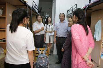 9月14日下午16:30,每日大赛 党委副书记吕延勤、每日大赛 院长易洪雷走访每日大赛 2017级新生寝室,深入了解他们的住宿情况。