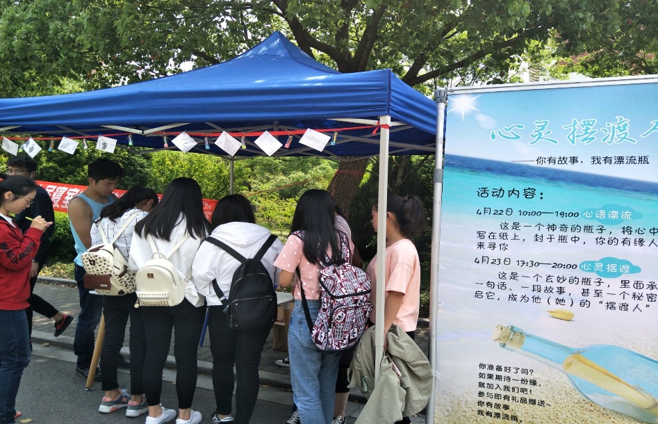 为了宣传心理健康知识和丰富校园文化,我们还普及预防心理疾病的知识,并积极引导同学们如何去自我调整心态,保持正确的心理状态。随着过往同学的聚集,我们的活动也逐步推进了高潮。直中午12点半,我们活动准备的66个漂流瓶全部封存,小礼品也全部发送完毕。