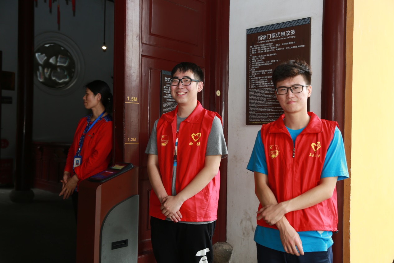 志愿者们兵分5路,或在景区入口检票,或在景区内维护秩序,主要分布在人流量较大的区域,引导游客有秩序、文明礼让地出行,不逗留,不推搡,保证古镇道路畅通无阻,并倡导广大游客自觉遵守社会公德,遵从景区秩序,维护良好的景区氛围。志愿者赵昕雅同学说,服务期间,经常会碰到各式各样的情况,更有外国友人前来咨询路线问题,志愿者们都用流畅的英语及时帮忙解答,此次活动不仅充分践行了“为人民服务”,更是检验和提升了自身的综合能力。