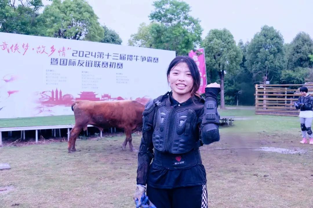 在第十三届掼牛争霸赛暨国际友谊赛联赛现场,令人惊奇的是,竟有一位看似文弱的女子在场上掼牛。只见她擒住牛角奋力下压,与牛僵持一番后,使用巧劲成功把牛掼倒。虽然马尾辫和衣服上都是泥,但她特别开心。