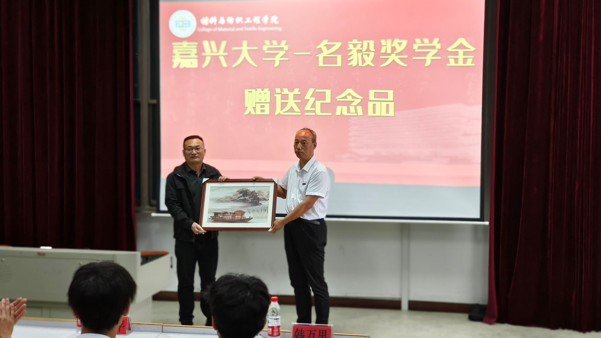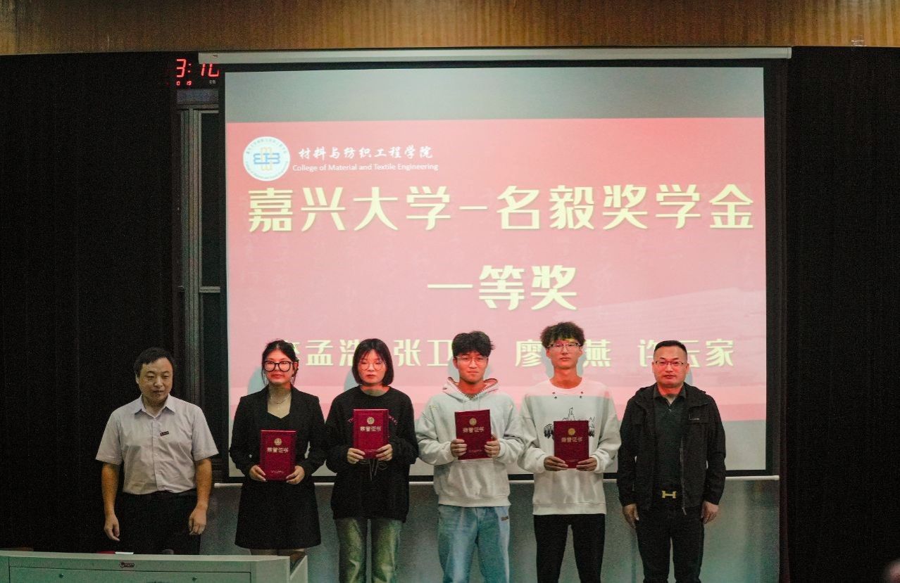 在博闻楼学术报告厅,“坚定梦想,毅力前行”非织造材料与工程专业名毅奖学金颁奖活动也在如火如荼地进行着。此次颁奖活动旨在表彰在学术、实践等方面表现突出的优秀学生,并激励更多学生树立远大目标、发扬坚毅品质。活动上,企业代表徐井分享了设立“名毅奖学金”的初衷和愿景,表达了对青年人才的期待与支持。学院领导代正伟致辞,对获奖学生表示祝贺,并鼓励他们继续努力,再创佳绩。颁奖环节上,企业代表和学院领导共同为获奖学生颁发了荣誉证书和奖学金。随后,获奖学生代表廖海燕发表感言,分享了她的学习成长经历和未来规划,暑期出国交流学生代表王婷和张梦菲上台分享了他们的海外学习心得和体会。
