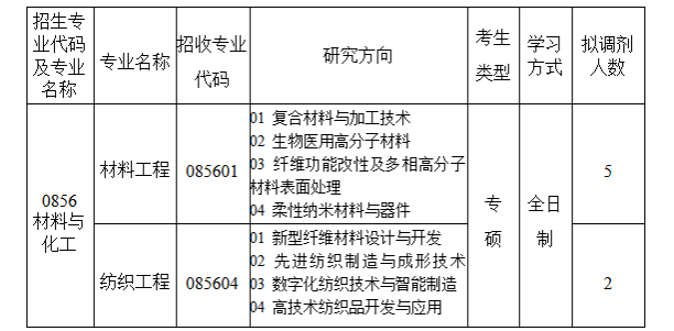 (2)调剂考生第一志愿专业与调入专业相同相近,或初试科目与调入专业初试科目相同相近。本学位点接受调剂的第一志愿专业范围包括:材料与化工(0856)、材料科学与工程(0805、0773)、纺织科学与工程(0821)、轻工技术与工程(0822)、纳米科学与工程(0877、0789、1406)、化学工程与技术(0817)、环境科学与工程(0830、0776)、生物医学工程(0831、0777)、药学(0780、1007、1055)、食品科学与工程(0832)、生物工程(0836)、生物与医药(0860)、化学(0703)、生物学(0710)、电子科学与技术(0809、0774)、计算机科学与技术(0812、0775)、电子信息(0854)、软件工程(0835)。
