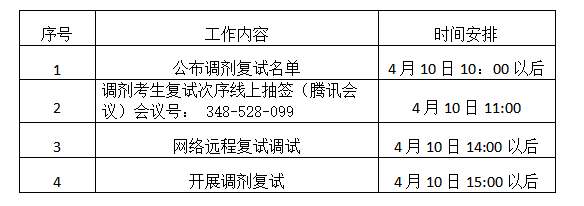 我院硕士研究生复试将采取网络远程复试方式进行,调剂复试安排初定如下,考生提交复试材料和参加线上心理测试时间学院另行通知: