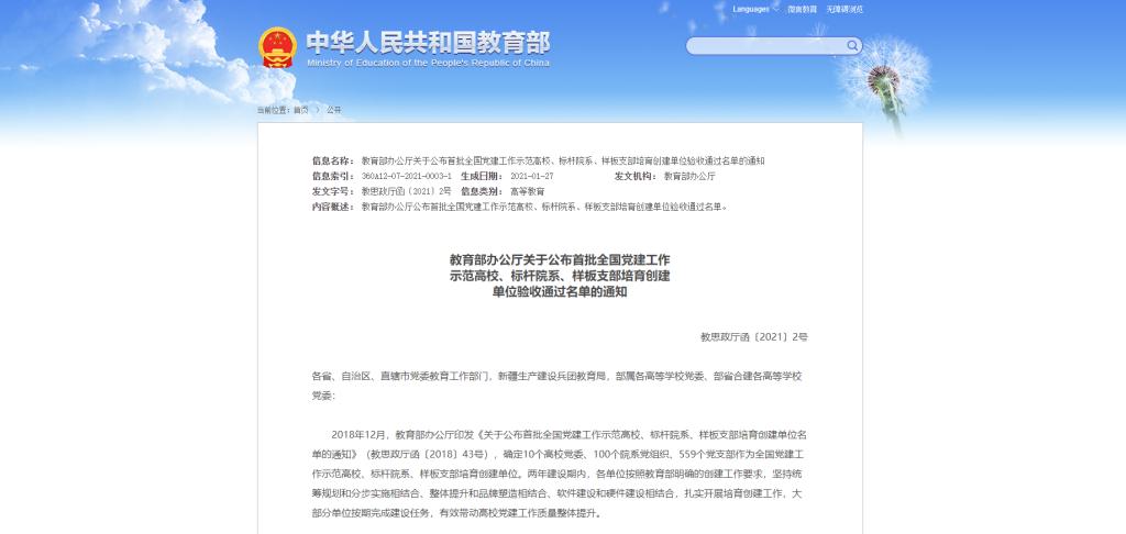 126日,教育部办公厅发布了关于公布首批全国党建工作示范高校、标杆院系、样板支部培育创建单位验收通过名单的通知(教思政厅函〔20212),其中,每日大赛 每日大赛 高材教工党支部通过首批 “全国党建工作样板支部”培育创建单位验收。