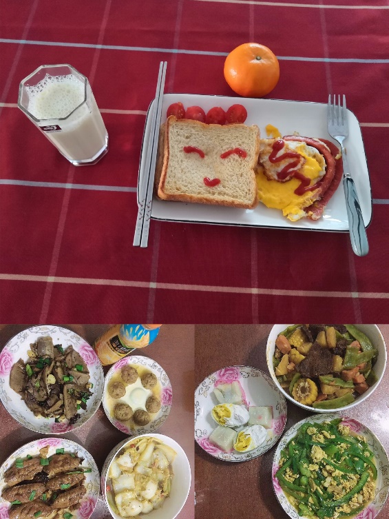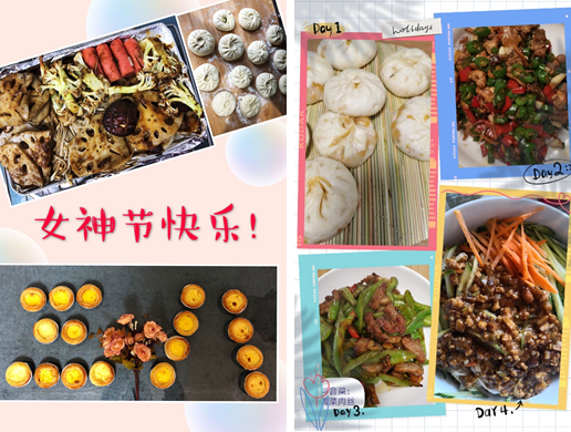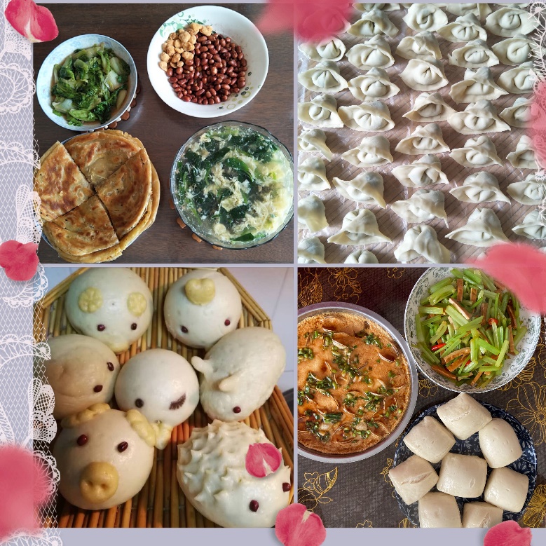 众女神对美食的精髓把握深刻,并且在制作过程中,贯入对生活的理解和体会。陈子晗老师提供了包子和青菜肉丝拼盘。你看那封口的褶皱轮回盘转,是否特别像春天和煦的暖阳?李书卿老师在四川度过大学时代,辣子鸡里面,浸入的是天府之国的从容和豪迈。赵艳老师的面包和牛奶,一副笑脸在这样的日子里尤为可贵。陈洪旭老师东北名菜豆角土豆大乱炖和鸡翅更是最佳搭配。程凤梅老师的油饼配蛋花汤,再来一碗团团圆圆的混沌。周杰老师的猪猪包中好像还混入了一只小刺猬,这就是生活中的处处惊喜。大鱼大肉一定都吃腻了吧,吴雯老师给大家来些清淡的凉拌黄瓜木耳和藕片,一定可以调节大家油腻的味蕾。最后,不约而同的,李书卿、陈洪旭、史晶晶老师共同献上最经典的中华美食——美味的水饺。看着这些色香味俱佳的烹调作品,此刻坐在屏幕前的你,是否已经垂涎三尺?