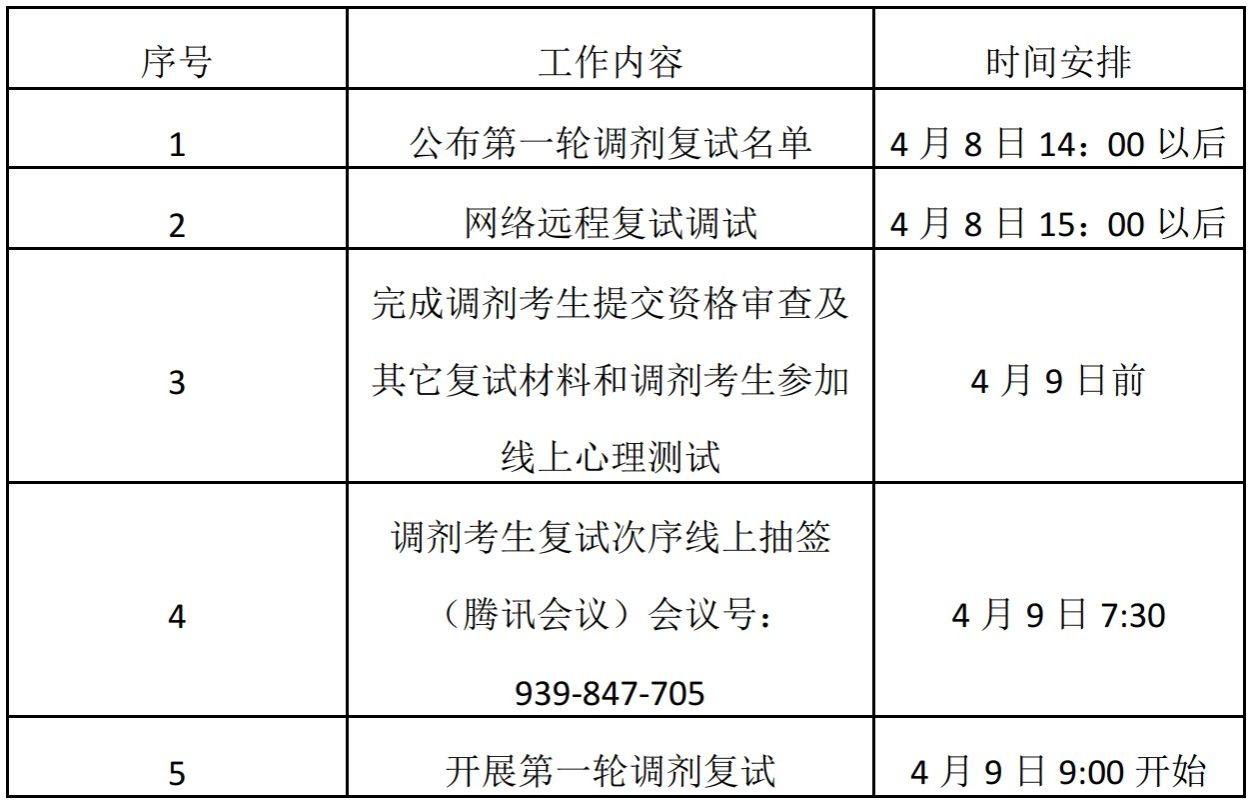 3.复试期间请考生保持手机畅通,网络远程复试调试及复试分组次序抽签,将由工作人员于4月8日另行电话通知,请考生及时响应并做好线上复试准备。未尽事宜按照上级和学校有关文件执行。
